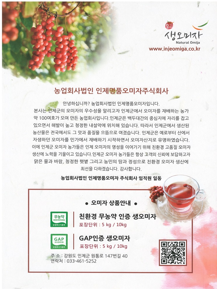 회사명 : 농업회사법인인제명품오미자(주) | 사업자등록번호 : 223-81-17345 [사업자정보확인] | 주소 : 강원도 인제군 북면 원통로147번길 40 1층